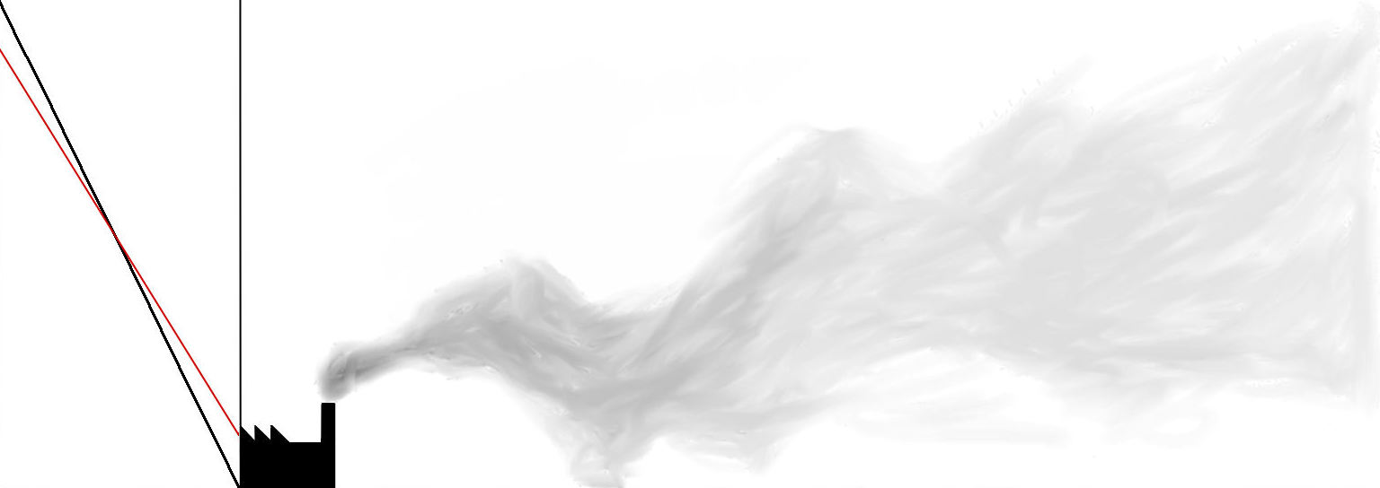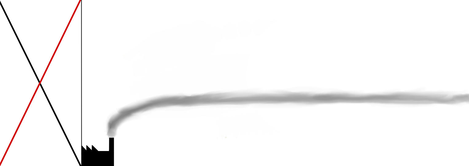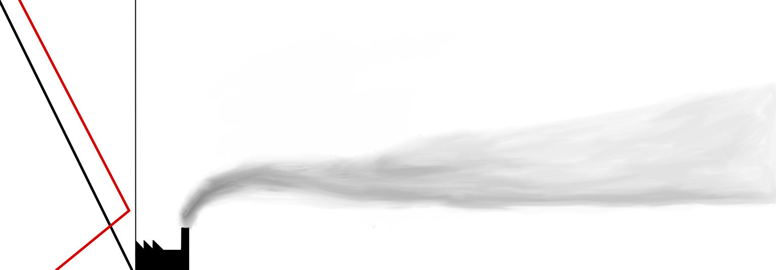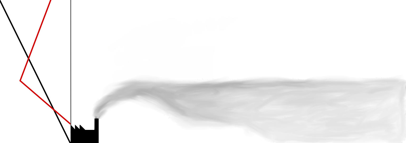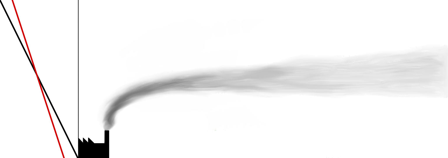 | De basis voor de beschrijvingen is een fabriek die via een schoorsteen uitlaatgassen in de atmosfeer uitstoot. De windrichting is westelijk van links naar rechts, waardoor de uitlaatgassen na een zekere verticale verspreiding horizontaal draaien. Deze initiële gradiëntfase is te wijten aan de doorgaans hogere temperatuur van de uitlaatgassen. De uiteindelijk bereikte hoogte wordt de effectieve schoorsteenhoogte genoemd. In de figuren vertegenwoordigt de rode lijn de temperatuurgradiënt van de atmosfeer en de zwarte lijn de adiabatische gradiënt van het luchtdeeltje |