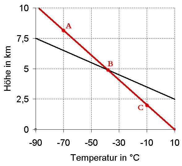 | Door de neutrale gelaagdheid van de atmosfeer koelt een stijgend luchtpakket net zo snel af als de omringende atmosfeer. De punten A, B en C, die elk een luchtdeeltje vertegenwoordigen dat adiabatisch afkoelt of droog opwarmt (rode lijn), zijn daarom identiek aan de omstandigheden van de omgevingslucht, weergegeven als zwart. De opwaartse en neerwaartse kracht van het luchtdeeltje houden elkaar dus in evenwicht, omdat er geen verschil in dichtheid bestaat tussen het luchtdeeltje en de betreffende luchtlaag. Omdat er geen resulterende kracht is, verandert het luchtdeeltje niet zelfstandig van verticale positie en zodra het geforceerde optillen van B naar A of het neerlaten van B naar C stopt, blijft het luchtdeeltje stabiel in hoogte |