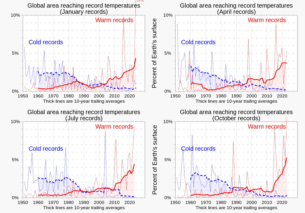 1: Nieuwe records op het gebied van hoge temperaturen hebben op een steeds groter deel van het aardoppervlak de nieuwe records op lage
