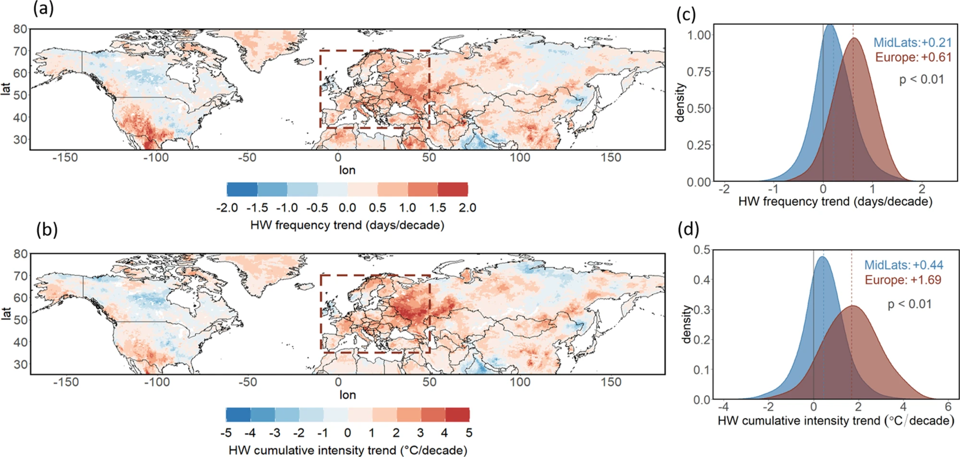 Kaart met toenemende trends in hittegolven (frequentie en cumulatieve intensiteit) op de middelste breedtegraden en in Europa,