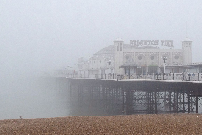 Zeemist die de pier van Brighton