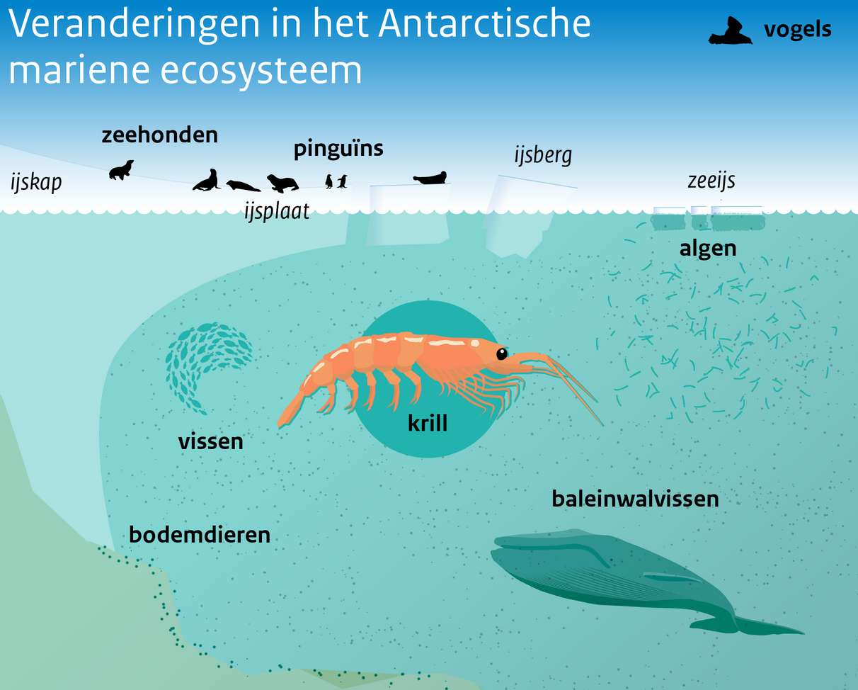 In het Antarctische mariene ecosysteem speelt krill – een kreeftachtig beestje van maximaal zes centimeter - een sleutelrol. Het wordt door