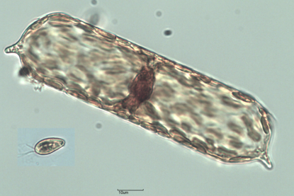 fytoflagellaat Geminigera (linksonder). Krill voedt zich alleen met grote algen. (Foto: Anita Buma) |