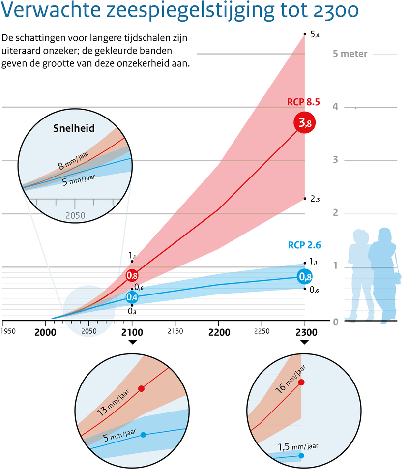 af van de hoeveelheid broeikasgassen die mondiaal wordt uitstoten. De nieuwste zeespiegelscenario’s uit het SROCC-rapport (2019) van het IPCC vallen iets hoger uit dan de schattingen uit het vorige rapport van het IPCC uit 2013. Vooral de bovengrens voor een scenario waarin de broeikasgasemissie blijft stijgen, is naar boven bijgesteld: deze staat nu op 1,1 meter zeespiegelstijging in 2100 ten opzichte van de referentie periode 1986-2005. Deze bovengrens stond in het vorige IPCC-rapport op 0,98 meter. Deze verhoging komt doordat er steeds meer aanwijzingen zijn dat de Antarctische ijskap sneller kan afsmelten dan voorheen werd gedacht. Er zijn aanwijzingen dat er nu al processen optreden waardoor delen van de ijskap instabiel kunnen worden met een versneld massaverlies tot gevolg. |