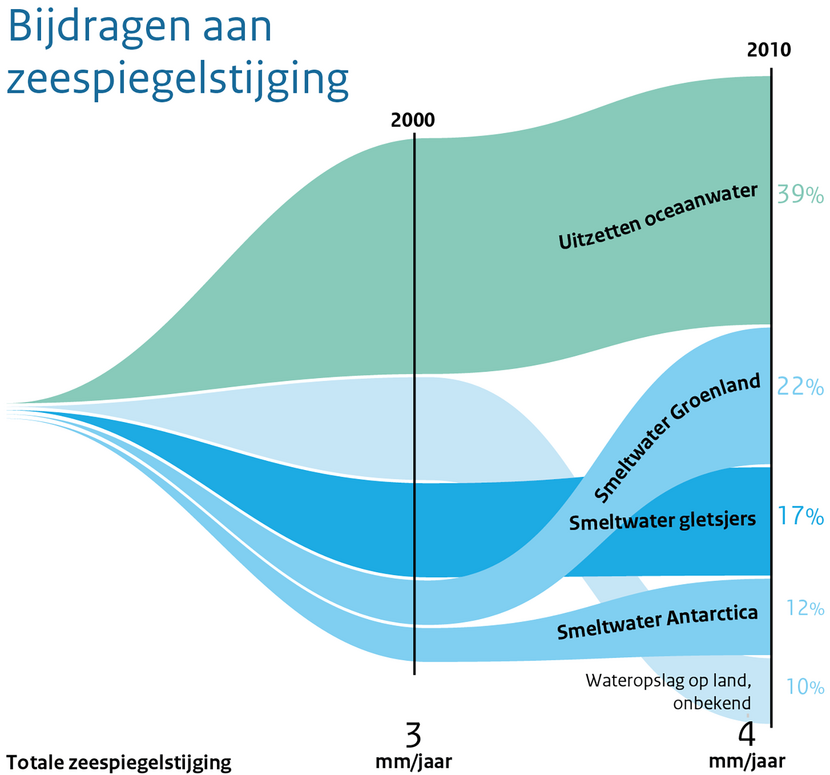 De oorzaak van de versnelde afsmelt ligt in het steeds warmer wordende oceaanwater waardoor de ijsplaten, die op het warme water drijven, aan de onderzijde in hoog tempo afsmelten. Met steeds minder beschermende ijsplaten – de steunberen van de ijskap – smelt ook de vier kilometer hoge ijskap steeds sneller af. Dit kan het begin zijn van een onomkeerbaar proces. Vooral het deel van de ijskap dat onder water ligt kan instabiel worden, waardoor totale afsmelt van grote delen van de ijskap niet meer te voorkomen is. Als dat gebeurt, zal Antarctica nog eeuwen ijsmassa blijven verliezen, zelfs als het klimaat stabiliseert. De gemeten versnelling in zeespiegelstijging is vooral te verklaren door een toename van het massaverlies van Groenland en Antarctica. De bijdrage van landijs, gletsjers en ijskappen samen is sinds 2006 zelfs groter dan de bijdrage door de uitzetting van het oceaanwater. |