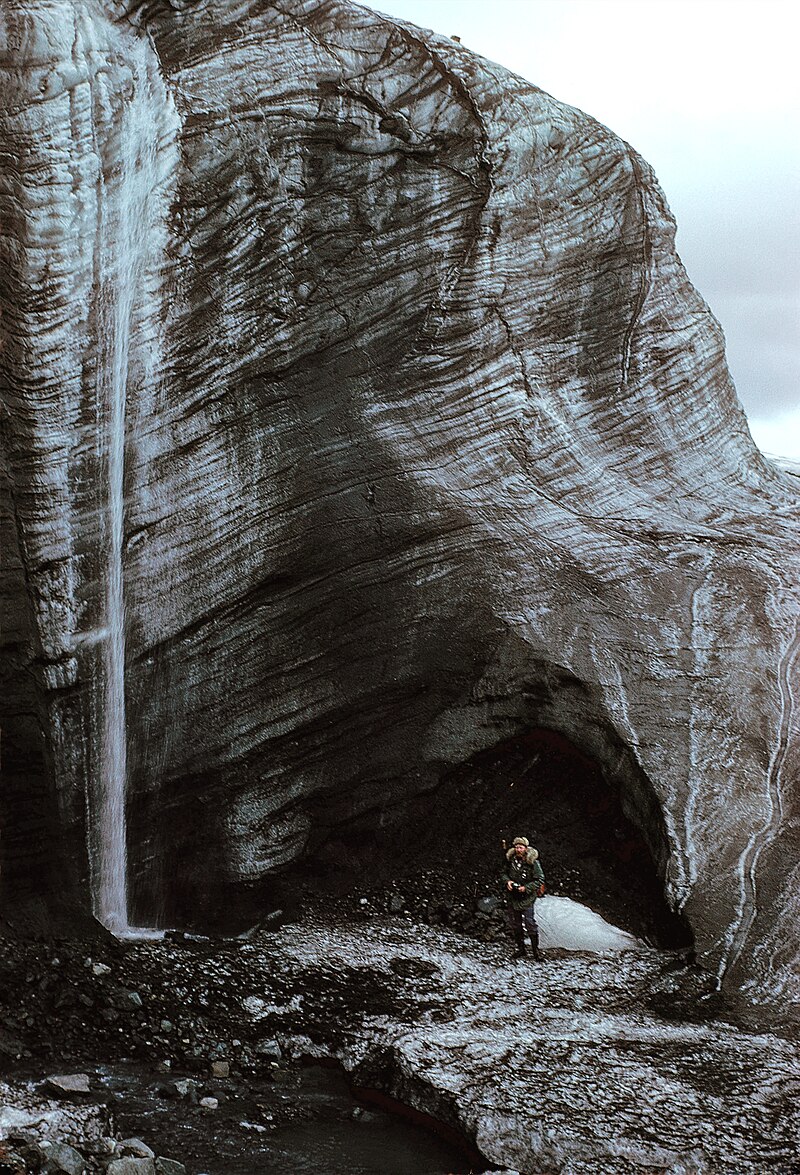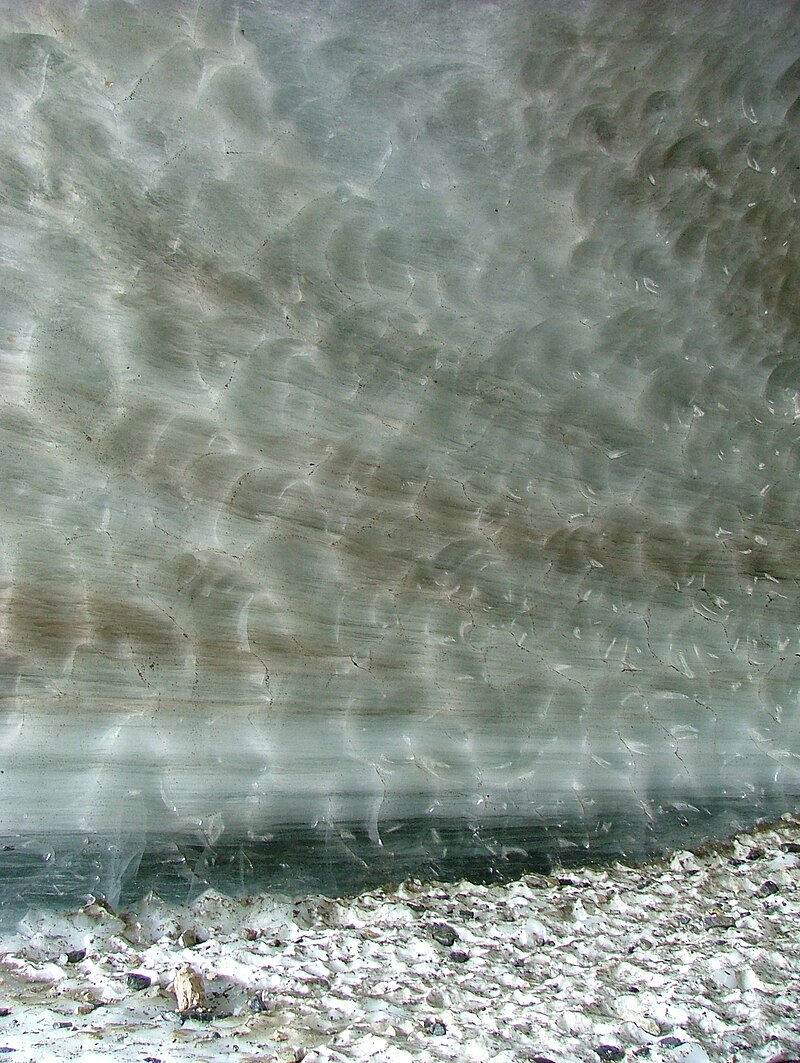 | Onder de evenwichtslijn is gletsjersmeltwater geconcentreerd in stroomkanalen. Smeltwater kan zich verzamelen in proglaciale meren boven op een gletsjer of via moulins afdalen naar de diepten van een gletsjer. Stromen in of onder een gletsjer stromen in englaciale of subglaciale tunnels. Deze tunnels komen soms weer tevoorschijn aan het oppervlak van de gletsjer. |
