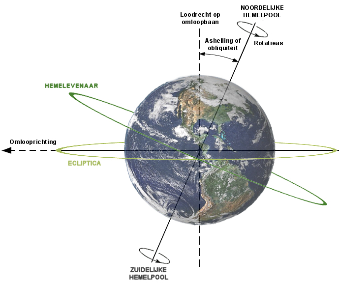| De obliquiteit, of de hoek die de aardas maakt met de normaalvector van het vlak van de aardbaan, varieerde de afgelopen 5 miljoen jaar tussen 22,0425° en 24,5044° met een periode van
