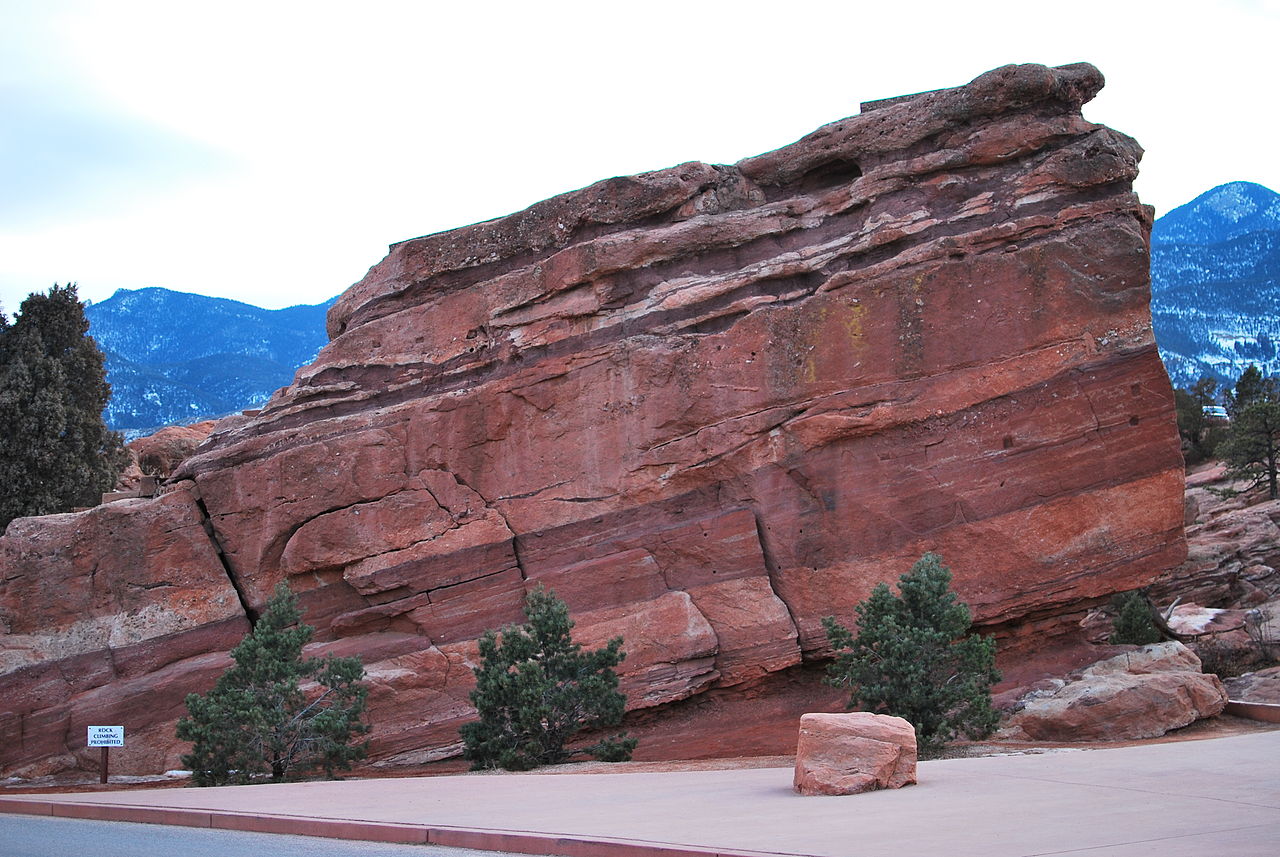 | 1: Een rotspartij met een geologische gelaagdheid: Steamboat Rock in de 'Tuin der goden, in Colorado Springs (VS) |