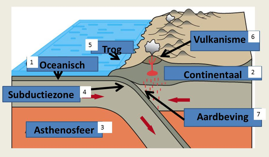 4 - lithosferische mantel, 5 - oceanische trog, 6 - gebergtevorming en vulkaanboog |