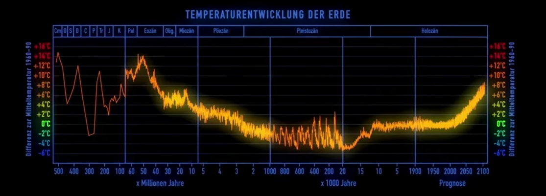 | Temperatuurverloop van de aarde in de afgelopen 500 miljoen jaar (vereenvoudigde reconstructie en hoge voorspelling tot 2100). Bron: ZDF |