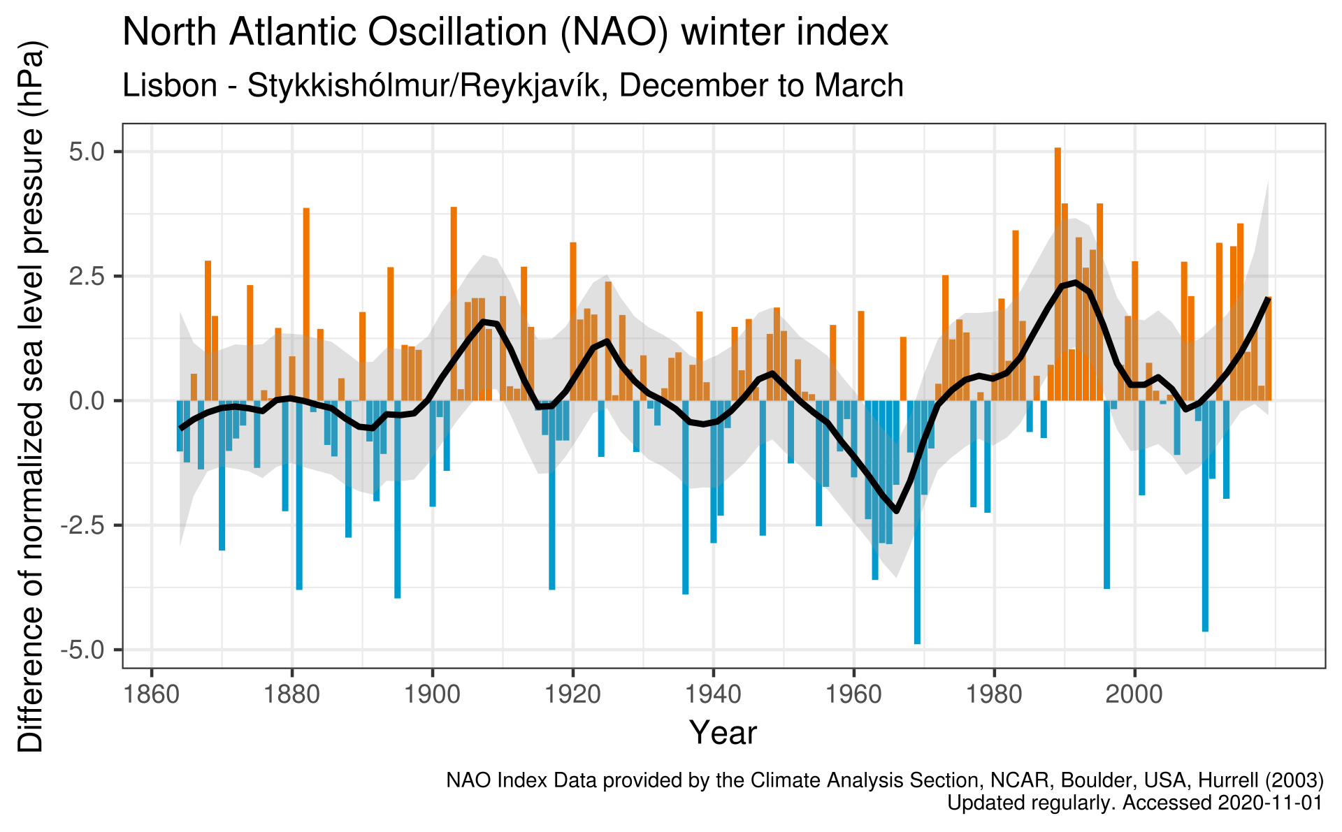 Deze jaarlijkse variatie wordt de Noord-Atlantische oscillatie (NAO) genoemd. |