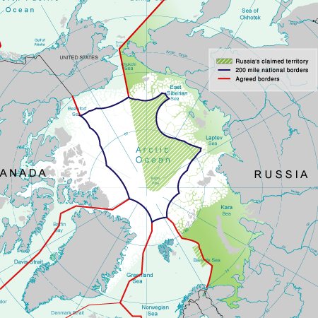 | Om deze reden, en toegevoegd aan het geostrategische belang, maakten twee Russische Mir bathyscaphes op 2 augustus 2007 een duik in de Noordelijke IJszee, op de Noordpool, en installeerden een Russische vlag op de bodem, evenals een capsule met een boodschap voor de komende generaties. De Mirs verzamelden bewijsmateriaal om aan te tonen dat de onder water gelegen Lomonosov- en Mendelejev-bergketens de natuurlijke uitbreiding zijn van het Russische continentale plat, een hypothese die, indien bevestigd, Rusland in staat zou stellen om in de toekomst exclusieve rechten te claimen op de exploitatie van minerale hulpbronnen in dit gebied. |