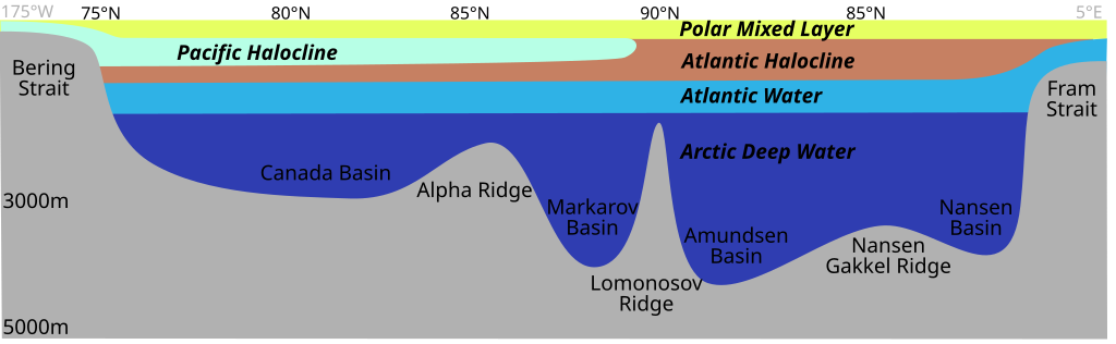 Het water in het Noordpoolgebied De Atlantische Oceaan heeft hetzelfde zoutgehalte als het bodemwater van de Noordpool, maar is veel warmer (tot 31 °C). In feite is deze watermassa eigenlijk warmer dan oppervlaktewater en blijft alleen onder water vanwege de rol van het zoutgehalte in