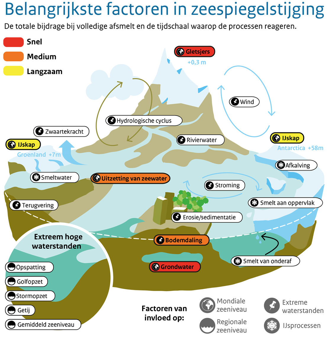 De belangrijkste toekomstige gevolgen van een steeds sneller stijgende zeespiegel voor Nederland op een rij (zie ook onderstaande figuur):