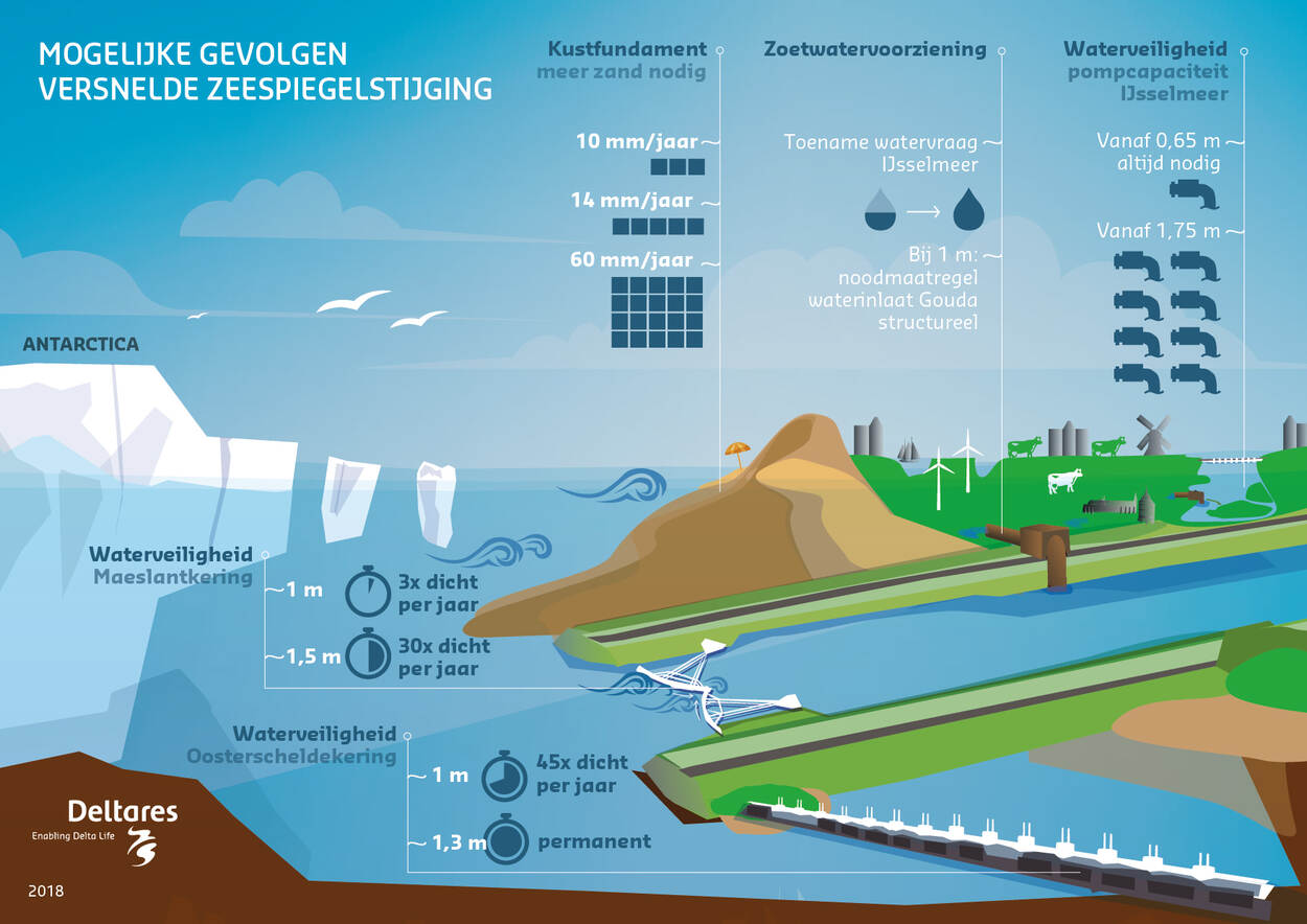 | Het Deltaprogramma houdt tot nu toe rekening met een zeespiegelstijging tot maximaal 1 meter langs de Nederlandse kust, aan het eind van deze eeuw. Deze grens is gebaseerd op de KNMI-klimaatscenario’s uit 2014. Het SROCC-rapport 2019 van het IPCC laat zien dat de bovengrens van de waarschijnlijke zeespiegelstijging wat hoger is dan we in 2014 dachten Ook al gaat de zeespiegelstijging de afgelopen jaren in Nederland iets langzamer dan wereldwijd gemiddeld, de verwachting is dat Nederland niet uit de pas zal blijven met het wereldgemiddelde, omdat de Noordzee immers in directe verbinding met de oceanen staat. De zeespiegel zal ook in Nederland steeds sneller gaan stijgen. Als delen van de Antarctische IJskap instabiel worden, dan kan die versnelling na 2050 flink toenemen. |