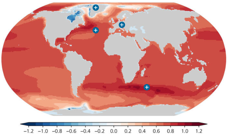 | De gemiddelde temperatuur van de bovenste laag van de oceaan is sinds 1970 met 0,11 graden per tien jaar gestegen. Hierdoor komen hittegolven in zee en andere extreme gebeurtenissen vaker voor. In de 21e eeuw zal de opwarming van de oceaan naar verwachting doorgaan, maar wel veel minder hard als we de uitstoot van broeikasgassen weten te verminderen of stoppen. |