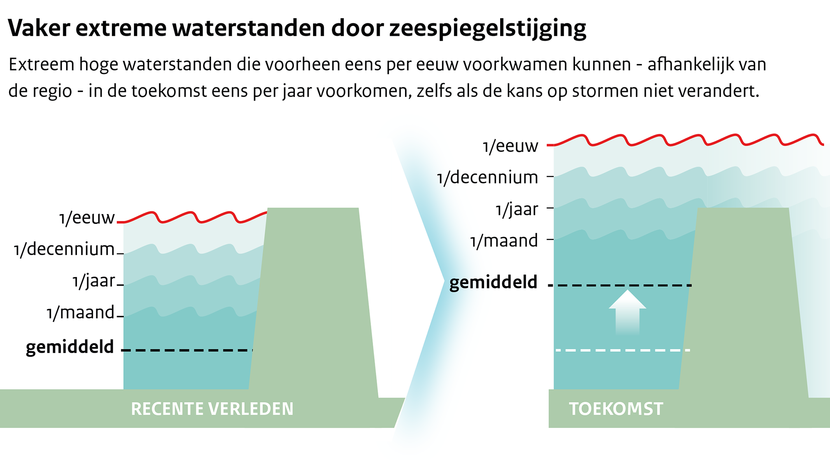 De komende decennia zijn het vooral de extreme kortdurende waterstanden die de risico’s van zeespiegelstijging bepalen. |
