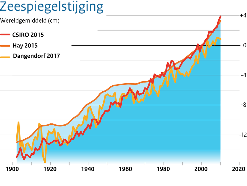 Wereldwijd is de zeespiegel van 1902 tot 2010 gemiddeld tussen de 12 en 21 cm gestegen. Deze stijging gaat steeds sneller, de laatste jaren