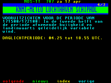| Op pagina 707 worden gedurende de daglichtperiode actuele waarnemingen van een aantal Nederlandse stations gepresenteerd. De waarnemingen worden op teletext gepresenteerd in een code, die afgeleid is van de METAR (METEOROLOGICAL AERODROME ROUTINE WEATHER REPORT)-code. |