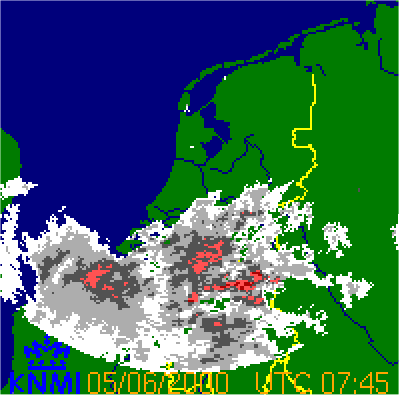 beelden tonen waar zich echo's van neerslaggebieden bevinden, waarbij de regenintensiteit met een kleurcode wordt aangegeven. |