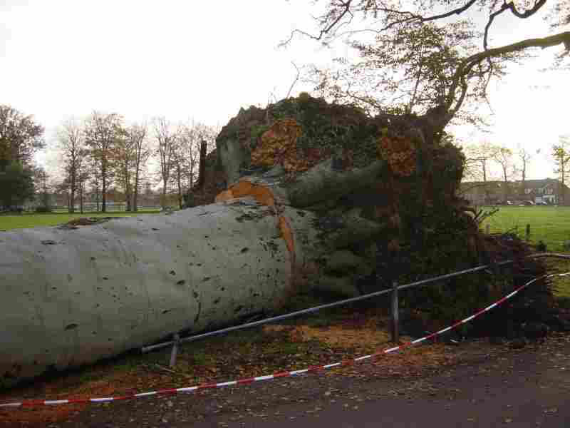 | Bij windkracht 10 worden bomen ontworteld, zoals deze 250 jaar oude boom bij de storm van 27 oktober 2002 |