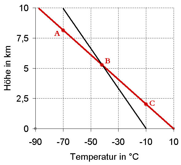 | Door de neutrale gelaagdheid van de atmosfeer koelt een stijgend luchtpakket net zo snel af als de omringende atmosfeer. De punten A, B en C, die elk een luchtdeeltje vertegenwoordigen dat adiabatisch afkoelt of droog opwarmt (rode lijn), zijn daarom identiek aan de omstandigheden van de omgevingslucht, weergegeven als zwart. De opwaartse en neerwaartse kracht van het luchtdeeltje houden elkaar dus in evenwicht, omdat er geen verschil in dichtheid bestaat tussen het luchtdeeltje en de betreffende luchtlaag. Omdat er geen resulterende kracht is, verandert het luchtdeeltje niet zelfstandig van verticale positie en zodra het geforceerde optillen van B naar A of het neerlaten van B naar C stopt, blijft het luchtdeeltje stabiel in hoogte |