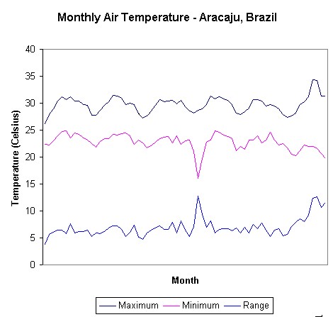 Het effect van breedtegraad, tropisch klimaat, constante zachte wind en ligging aan zee laten kleinere gemiddelde temperatuurbereiken, kleinere temperatuurvariaties en een hogere gemiddelde temperatuur zien (de grafiek rechts, genomen voor dezelfde periode als Campinas, in Aracaju,
