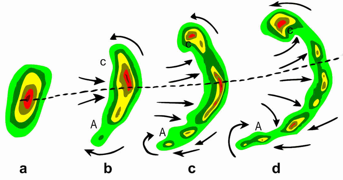 vortex te verzwakken. Het systeem ontwikkelt vervolgens een asymmetrische kommavormige echo. Sommige ingebedde tornado's of windstoten ontwikkelen zich binnen deze wervels. |