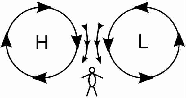 | Als je op het noordelijk halfrond met je gezicht uit de wind staat, bevindt een hogedrukgebied zich rechts en een lagedrukgebied links |