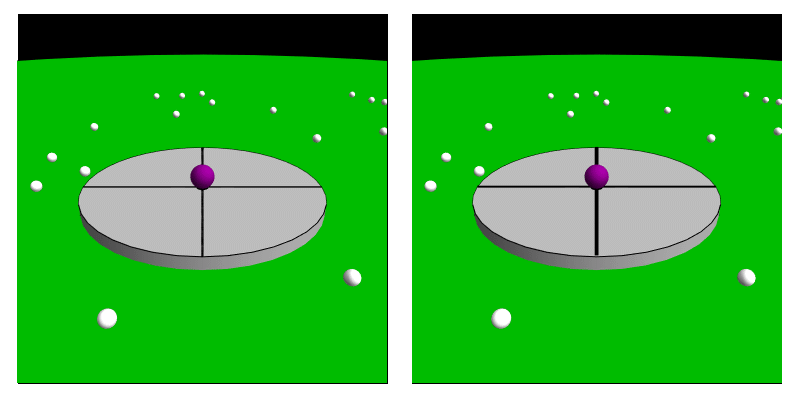 | Het corioliseffect: 1x bekeken vanuit een inertiaalstelsel en 1x vanuit een meedraaiend stelsel. |