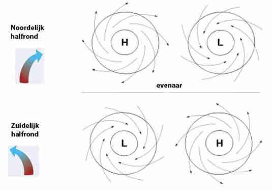 | Op het noordelijk halfrond stroomt door het corioliseffect de lucht dus rechtsom rond een hogedrukgebied en linksom rond een lagedrukgebied. |