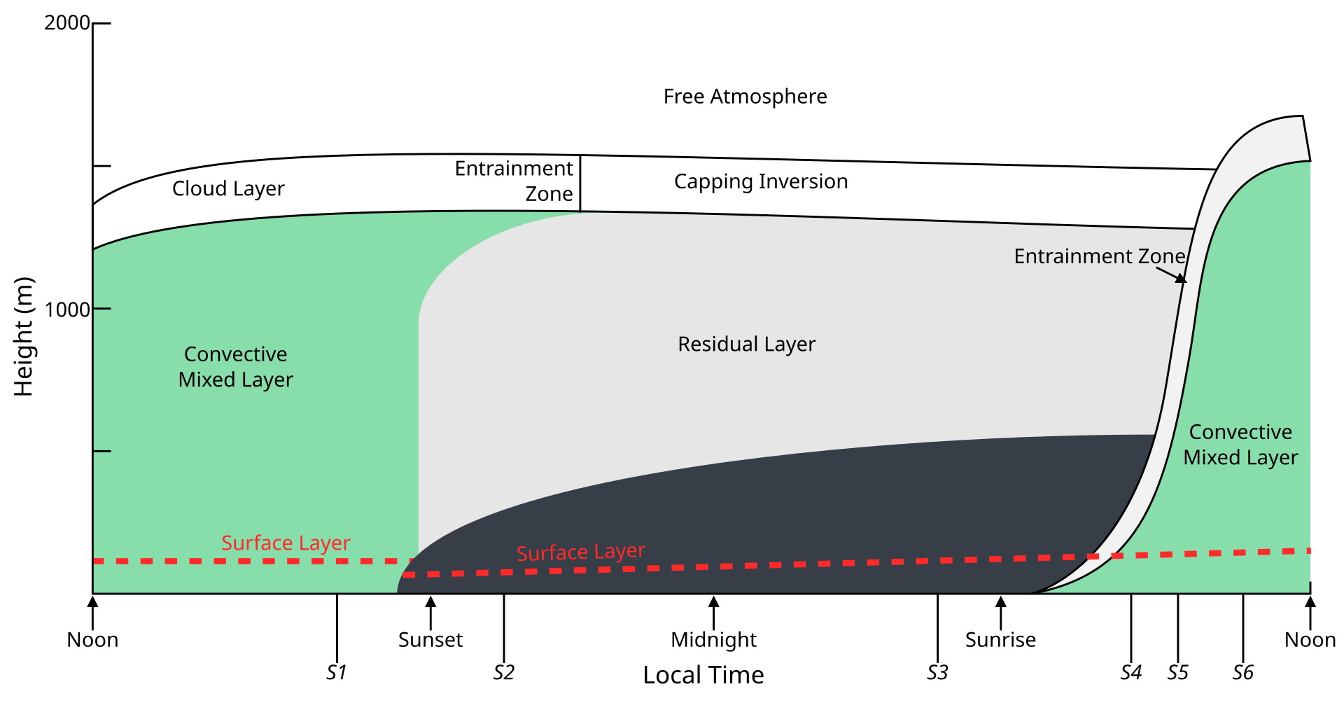 | De grenslaag is het deel van de atmosfeer dat het dichtst bij de grond ligt. Normaal gesproken verwarmt de zon de grond, die op zijn beurt de lucht er net boven verwarmt. Thermiek ontstaat wanneer deze warme lucht opstijgt in de koude lucht (warme lucht is minder dicht dan koude lucht), een proces dat convectie wordt genoemd. Een convectielaag zoals deze heeft het potentieel voor wolkenvorming, aangezien condensatie optreedt wanneer de warme lucht opstijgt en afkoelt. |