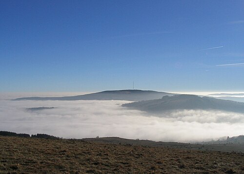 | Een capping inversie beperkt de verticale ontwikkeling van wolken. In deze afbeelding, genomen nabij Kreuzberg (Rhön), bevindt de inversie zich onder de top van de bergtoppen. |