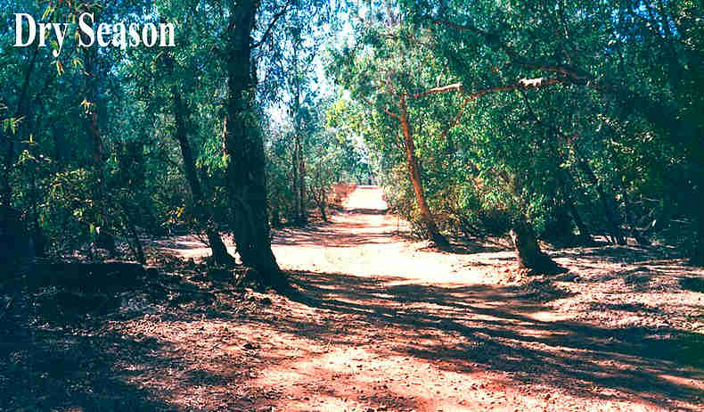 | Tijdens het droge seizoen is de luchtvochtigheid erg laag, waardoor sommige kroegen en rivieren opdrogen. Dit gebrek aan water (en gebrek aan voedselvoorziening) kan veel grazende dieren ertoe dwingen naar vruchtbaardere plekken te migreren. Voorbeelden van dergelijke dieren zijn: zebra's, olifanten, giraffen, neushoorns, antilopen en gnoes, waterbuffels, Kaapse buffels, gaur, tapir, emoes, struisvogels, nandoes en kangoeroes. Vanwege het gebrek aan water in de planten komen bosbranden (wildfires) veel voor. |