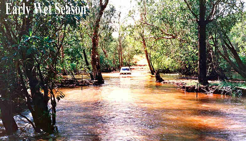 Een rivier in tropisch Noord-Australië tijdens de droge tijd (links) en regentijd (rechts)