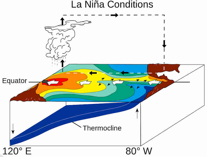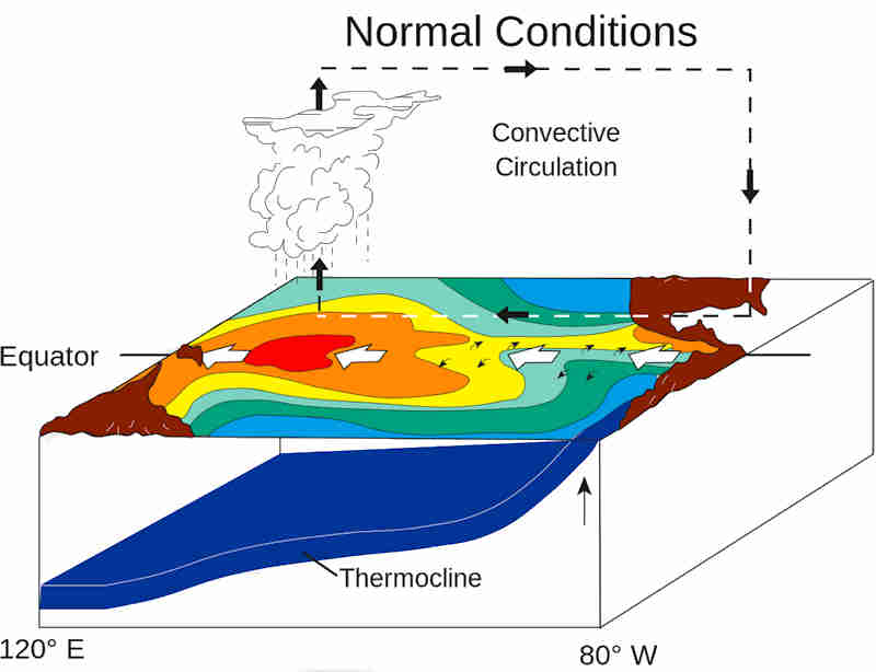 in de lucht nabij de kust niet condenseren en wolken of regendruppels vormen. De lucht blijft dus wolkenvrij tijdens ‘normale’ jaren in de oostelijke Stille Oceaan. De regen in de equatoriale gordel blijft dan grotendeels beperkt tot het uiterste westen van het bekken, nabij Indonesië. |