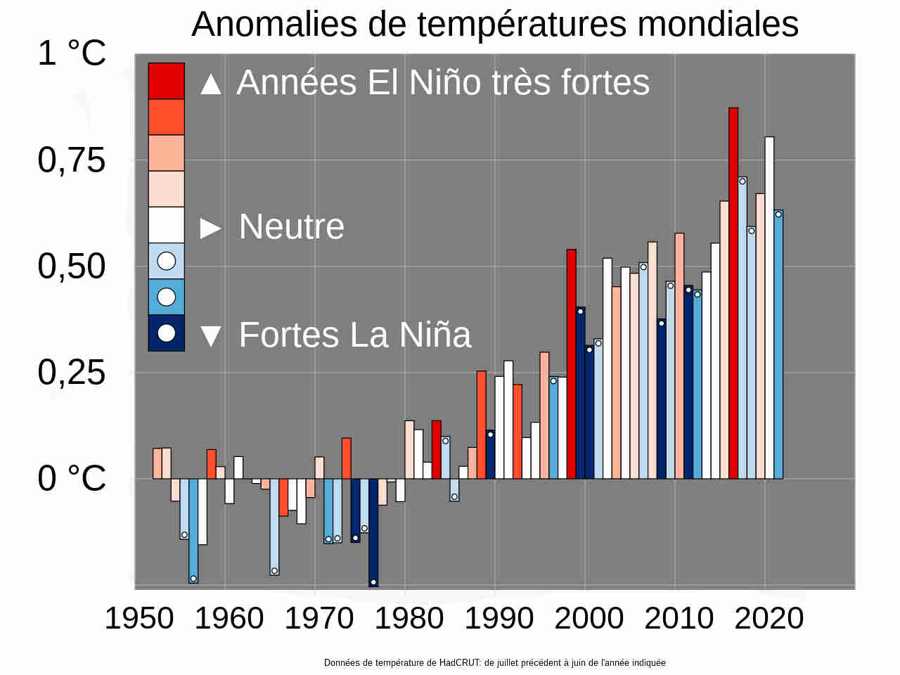 | Mondiale temperatuurafwijkingen en El Niño- en La Niña-verschijnselen. |