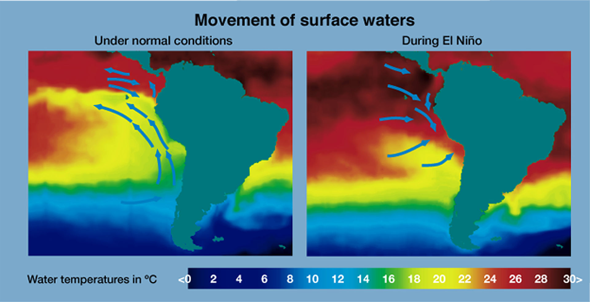 | Oppervlaktewaterbeweging tijdens normale periodes aan de linkerkant en onder El Niño aan de rechterkant. |