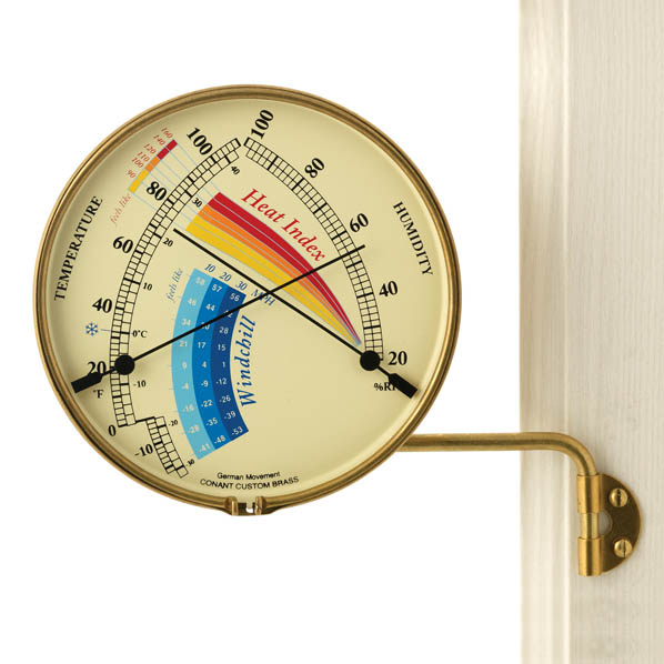 | Wijzerplaat die de waarde van de hitte-index of gevoelstemperatuur weergeeft op het snijpunt van de twee wijzers (temperatuur en relatieve vochtigheid). |