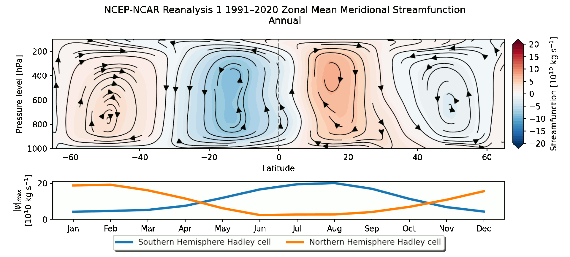 | Animatie van de Stokes-stroomfunctie uitgezet tegen druk en breedtegraad Jaarlijkse en maandelijkse gemiddelde Stokes-streamfunctie gebaseerd op waarden van 1991–2020 uit de NCEP/NCAR-heranalyse; de Hadley-cellen zijn de twee tegengesteld draaiende cellen naast de evenaar |