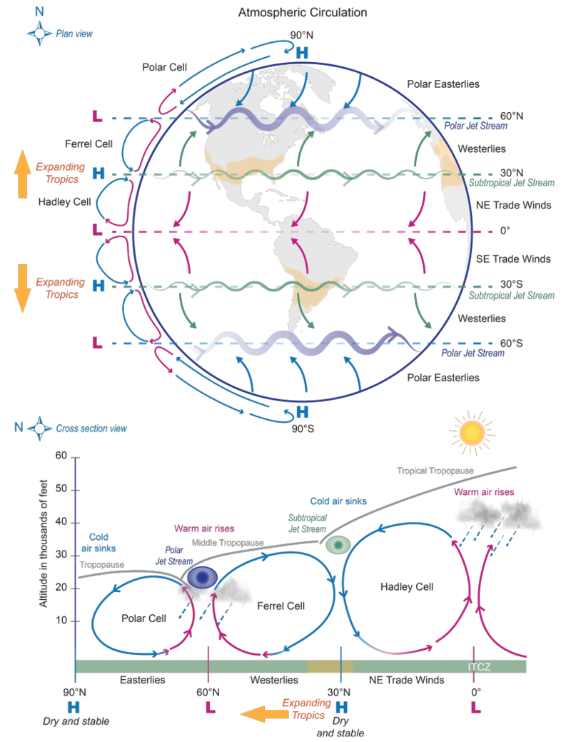 | Rechts: Klimaatverandering heeft geleid tot de uitbreiding van de Hadley-circulatie naar de polen |