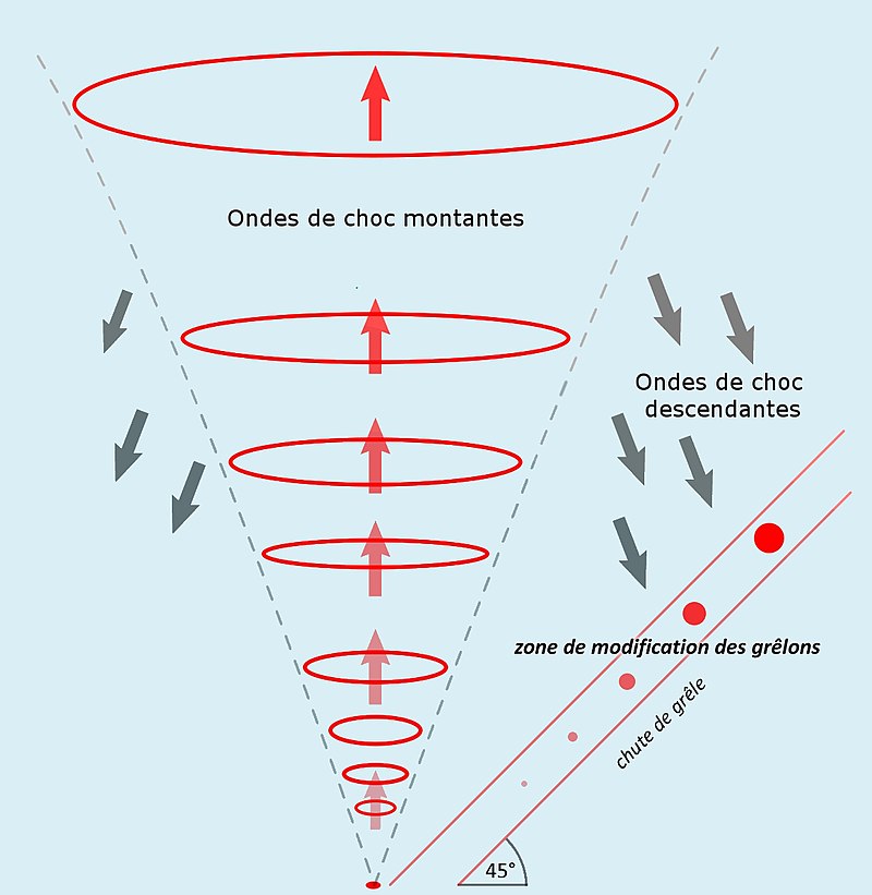 | Het concept van zaaien is geëlimineerd uit recente kanonnen, omdat ze geen rook produceren. Het is dus de hypothese over de schokgolven die door het antihagelkanon worden gegenereerd en die zich naar de wolk voortplanten, die wordt vastgehouden. Een deel van deze golven zou ook worden gereflecteerd op de tropopauze en op de terugweg zou het opnieuw inwerken op de zich vormende hagelstenen. Aangenomen wordt dat de golven verschillende effecten hebben op hagelstenen: |