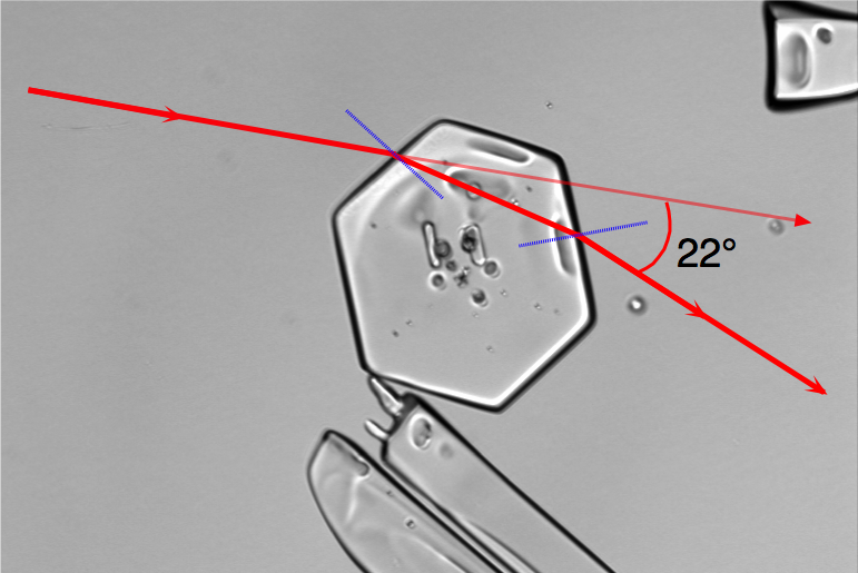 4: De doorbuiging door de zeshoekige platen is alleen te zien bij 22°. De groep kristallen waaruit licht komt,