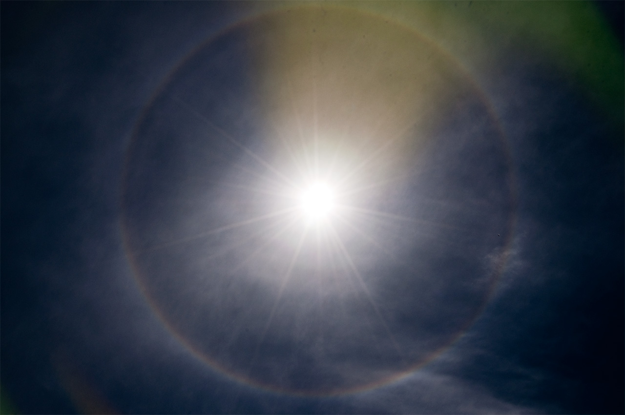 | 1: Een 22°-halo om de zon. Goed zichtbaar is het kleurverloop van rood aan de binnenzijde naar blauw aan de buitenzijde. |