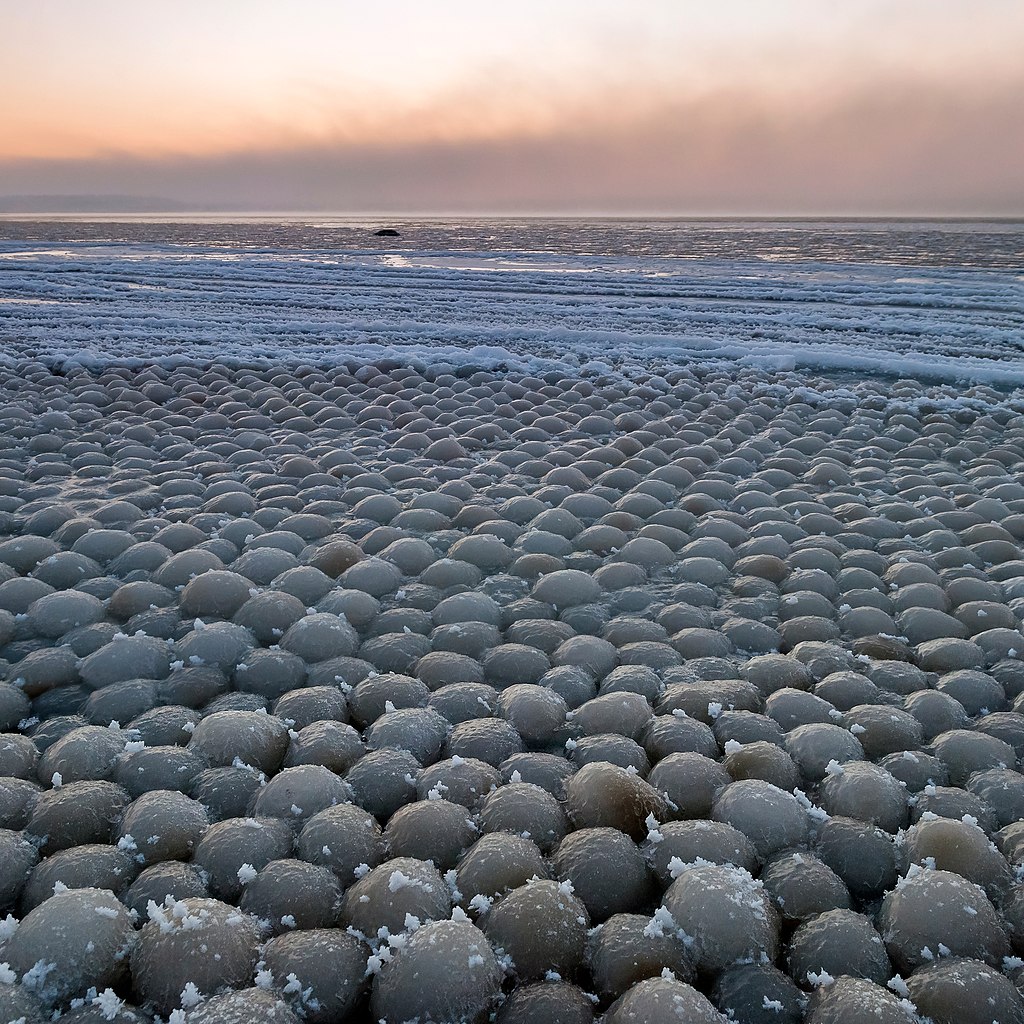 van een ijsvrij water rond het vriespunt ligt. Er begint zich ijs te vormen op het wateroppervlak en het wordt door de golven en de wind meegevoerd naar een zacht glooiend strand. De aanwezigheid van een bevriezende kern, zoals zand, dient om opeenvolgende ijslagen op te hopen om deze ballen te vormen tijdens het heen en weer gaan van de golven en de schokken tussen de stukken ijs. Na voldoende tijd kunnen de bevroren ballen