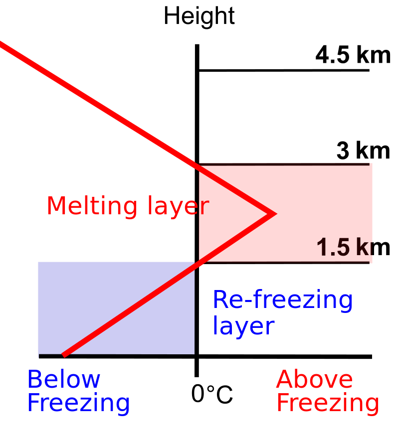 | 2: Effect van sneeuwvlokken die door warme (rode) en koude (blauwe) lagen van verschillende diktes gaan. Van links naar rechts: sneeuw, eerste type natte sneeuw, ijskoude regen, regen