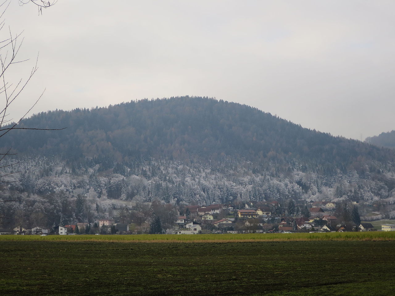 | Halverwege de Goritschnigkogel bij Klagenfurt is door langdurige temperatuurinversie een omgekeerde rijpgrens zichtbaar |