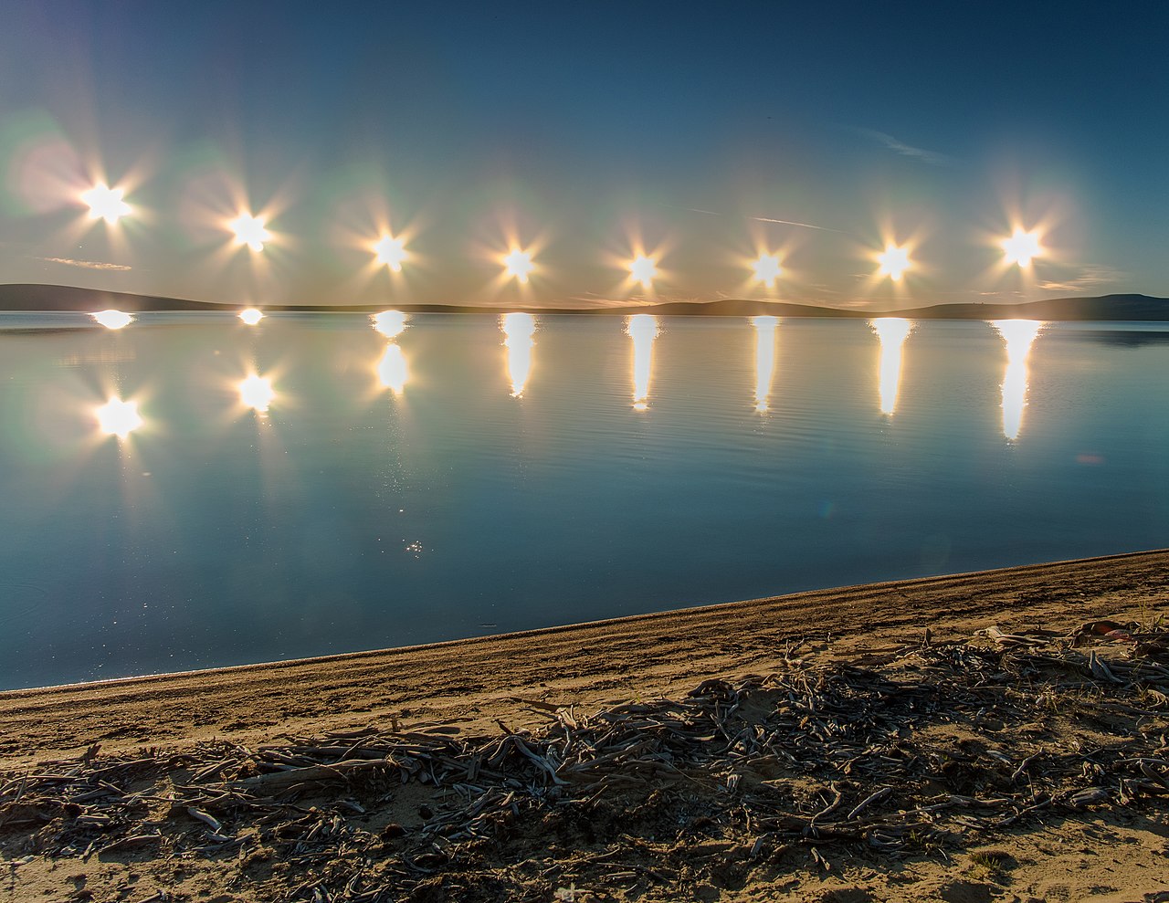 | 2: Meervoudige belichting van middernachtzon op het Ozhoginomeer in Yakutia, Rusland |
