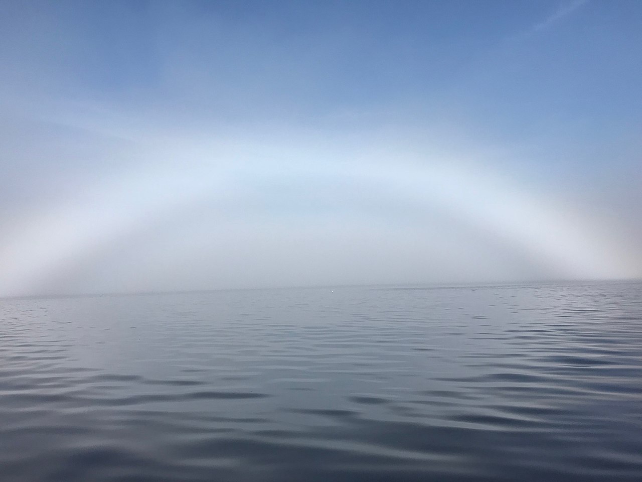 | Op de heuvels, de bergen en de koude nevels van de zee is het mogelijk om deze witte boog te zien. Dit lichtverschijnsel wordt op dezelfde manier waargenomen als het Brocken-spectrum of een glorie en het is zelfs mogelijk om al deze verschijnselen tegelijkertijd te zien. De boog wordt op dezelfde manier gevormd als een klassieke regenboog. De lichtbron achter de waarnemer verlicht de nevel of mist en het licht voert breking uit wanneer het lucht in de druppels laat stromen, gevolgd door gedeeltelijke diffractie, vervolgens interne reflectie en verdere breking wanneer het de druppels verlaat voordat het de waarnemer bereikt. Het licht wordt zeer weinig in verschillende kleuren opgesplitst, omdat de druppeltjes zeer klein zijn (minder dan 0,05 mm in diameter), wat een witte uitstraling geeft. |