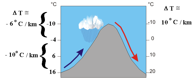 de afbeelding rechts) en zal er wolkenvorming plaatsvinden. In deze twee gevallen wordt de opgetilde lucht onstabiel als de temperatuurverandering van de opgetilde luchtmassa groter wordt dan die van de omgeving. |
